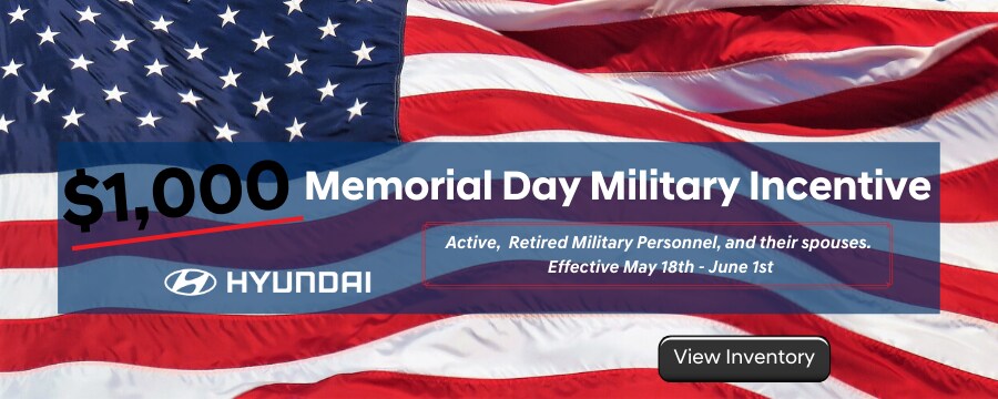Rosen Hyundai and Hyundai Motor America are pleased to announce their military incentive for the Memorial Day weekend. Available from May 18th through June 1st, head in to Rosen Hyundai for exclusive savings. To honor our veterans and current service members, Hyundai Motor America is doubling our Military incentive.Â